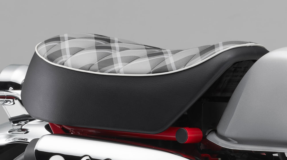 情熱的な赤はそのままに、フレームやスイングアームの塗装、あるいはリアサスペンションのスプリングカラーなどに変更が加えられています。チェック柄シートが組み合わさることで、これまでのスポーティーな印象から、「クラシックで上品なミニバイク」へと表情を変えています。