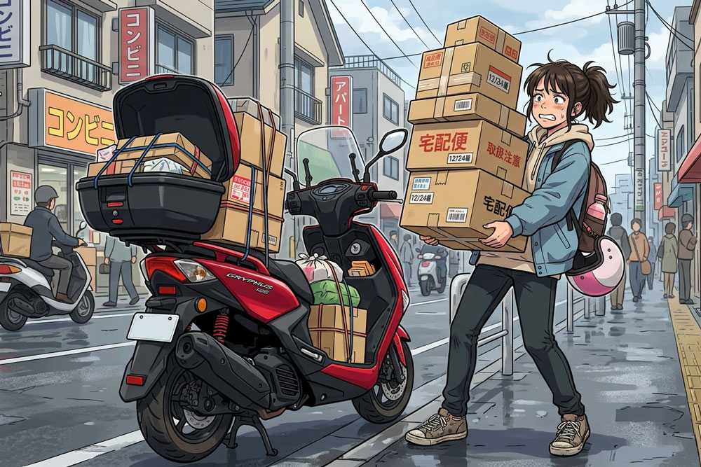 荷物の積載量は車と比べると圧倒的に少ない。リアボックスやトップケースを後付けすることでカバーできますが、大量の荷物を運ぶ用途には向きません。通勤用途に割り切って使うことが前提になります。