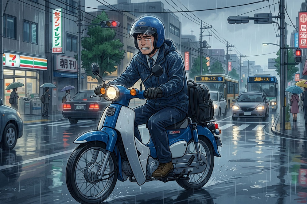 雨天・悪天候時は、レインスーツや防水グローブが必須になります。カッパを着る・脱ぐ手間や、視界の悪さ・路面の滑りやすさなど、車にはないストレスも発生します。梅雨時期・台風シーズンはバスや電車と使い分けるなど、柔軟な対応も必要です。