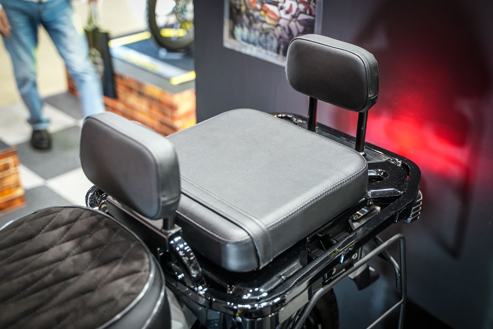 このデモ車、前後ともにバックレスト付きという構成になってた。タンデム時の安心感が段違いで、長距離でも疲れにくい。パッセンジャー用のピリオンシート&バックレストセットを追加することで、同乗者が体を預けられるようになる。「ふたりで走る」という選択肢がぐっと現実的になるパーツだ。