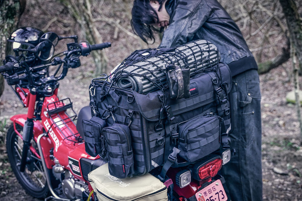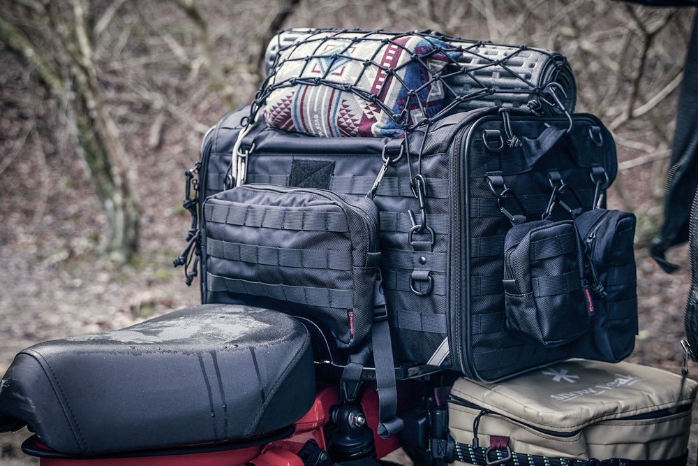 圧倒的な容量でキャンプ道具をすべて飲み込み、機能的なポーチですぐに必要なものを取り出せる。そして何より、バイクを降りて眺めたときの、あのミリタリーで無骨な佇まい。