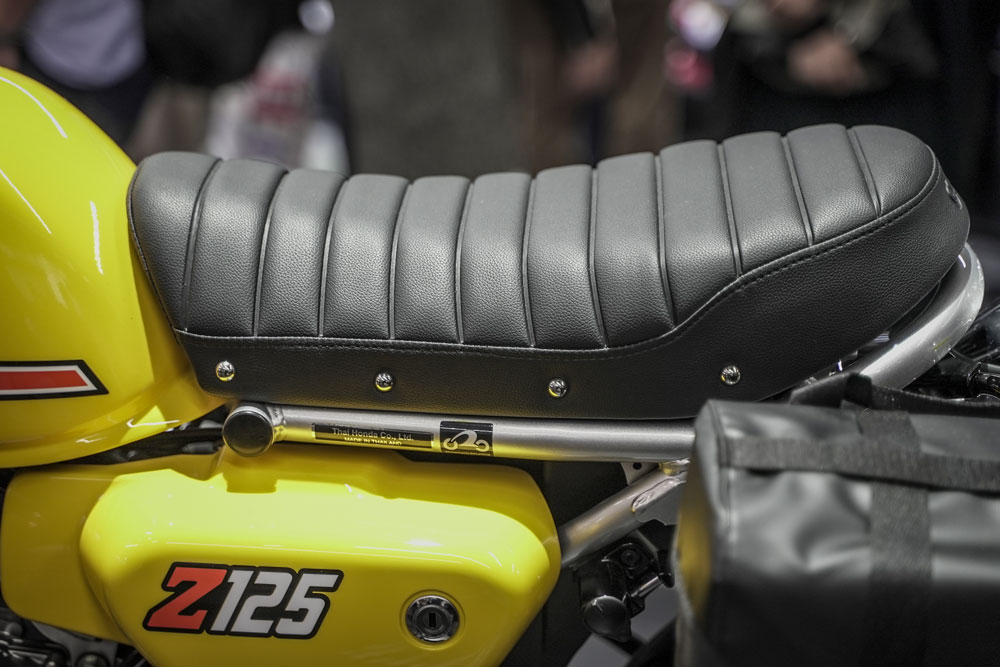 Gクラフト製のSCシート(鋲打ちタイプ)シート。クラシカルな雰囲気を残しつつ、カスタム感を際立たせています。シート一つで、モンキー125全体のレトロルックが格段に向上します。