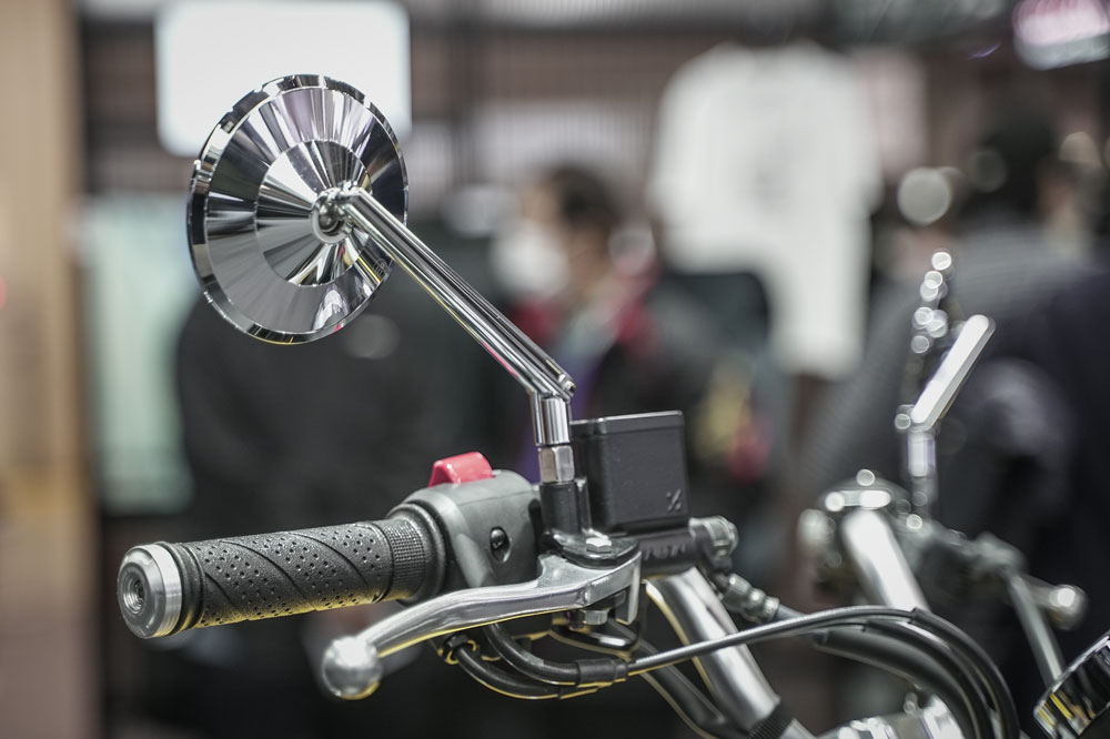 ハンドル周りの仕上げには、SP武川(タケガワ)製のハンドルバーエンドがキラリ。クロームミラーと調和し、ハンドル周りを引き締めます。