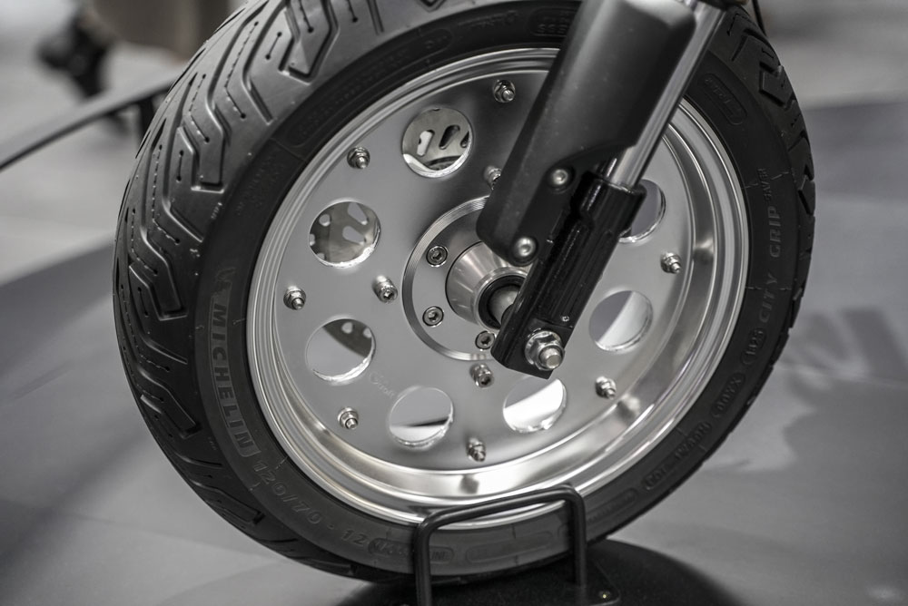 足元の迫力を決定づけているのが、Gクラフト製の12インチワイドホイールキット丸穴タイプのデザインが、レトロ感を残しつつも力強い印象を与えます。単に見た目をワイドにするだけでなく、Gクラフトのホイールは剛性が高く安定性も向上するため、走行性能とカスタムルックを両立しています。