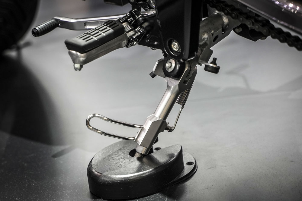 キャンプ道具などを積載した際にも、バイクが安定するよう角度を調整できる、機能性と見た目を両立した逸品です。
