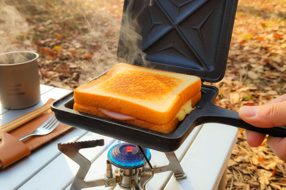 少し早起きして出発した日は、パンと具材を挟んで焼くだけのホットサンドが最高です。SOTOのホットサンドメーカーは折り畳める機構でバイク積載にピッタリ。