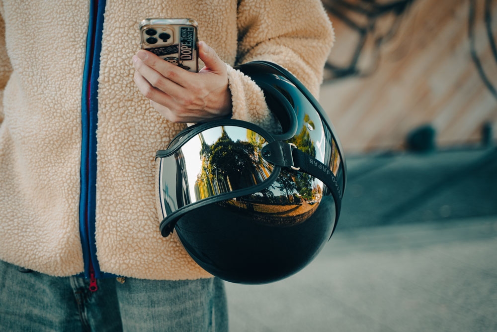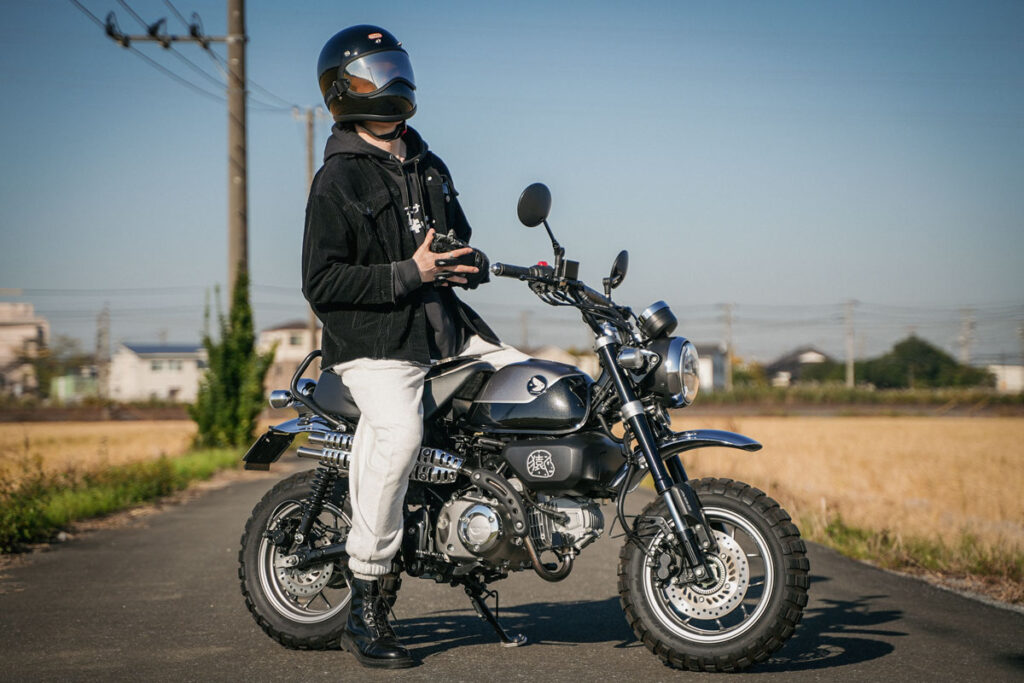 サングラスをあわせたシンプルなスタイルです。顔周りが開放的になり、バイクやファッションを際立たせるミニマルで「かっこいい」スタイルが完成します。